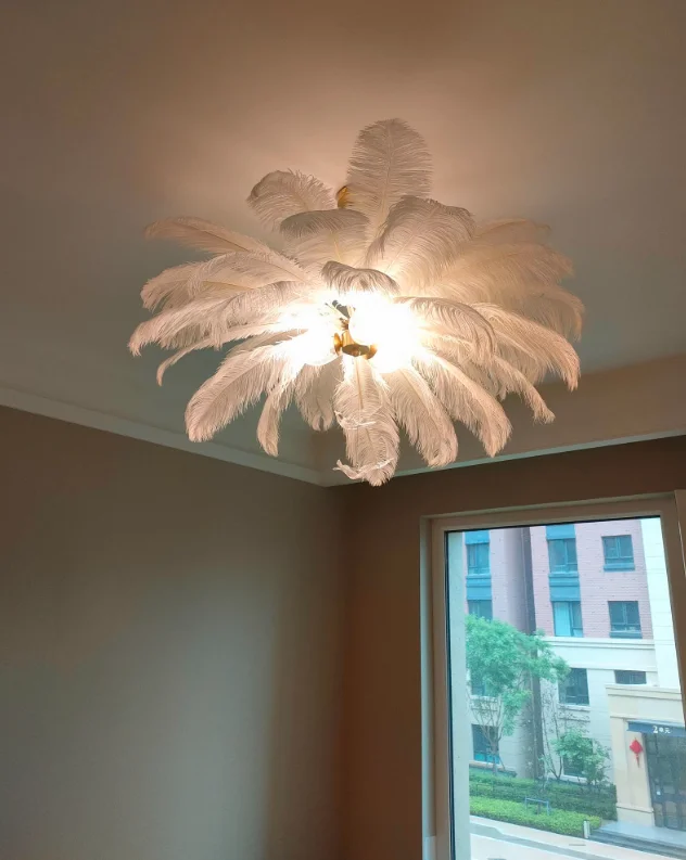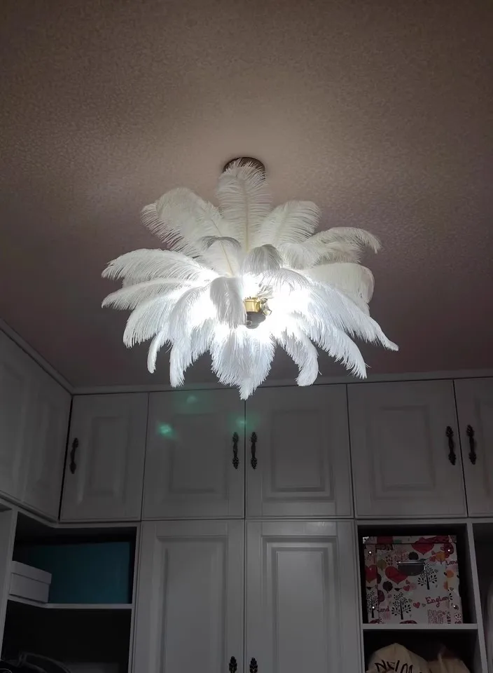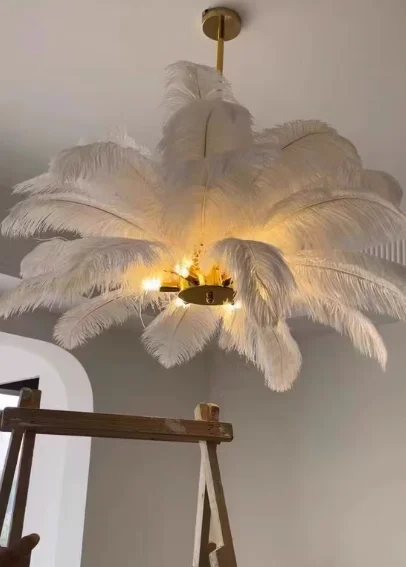 Le Grand Lustre Plumeau confère une ambiance aérienne et féerique grâce à son jeu de plumes d’autruche délicates, diffusant une lumière douce et enveloppante.