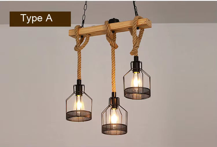 La base en bois brut apporte une touche chaleureuse et rustique, tandis que les trois descentes en corde renforcent l'esprit vintage. Les abat-jours en métal industriel complètent ce design, diffusant un éclairage ciblé et puissant.